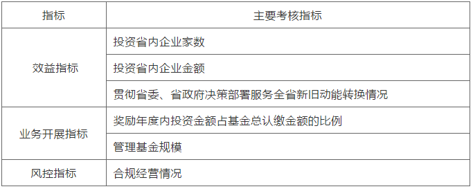(一)效益指標主要考核私募股權投資(管理)機構(gòu)所管理的基金對我省企業(yè)培育發(fā)展的促進和帶動作用,主要指標有投資省內(nèi)企業(yè)家數(shù)、投資省內(nèi)企業(yè)金額以及貫徹省委、省政府決策部署支持服務我省新舊動能轉(zhuǎn)換情況。