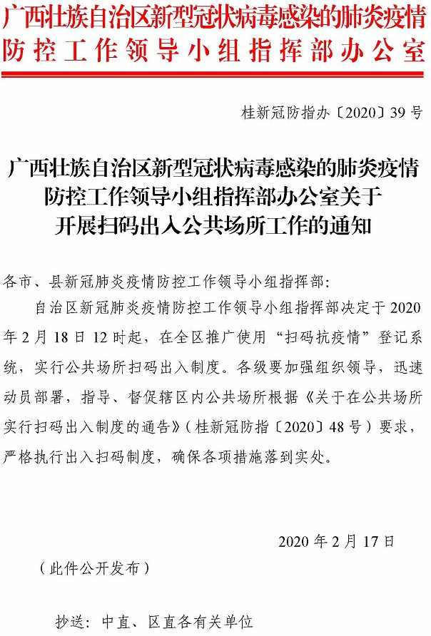 桂新冠防指辦〔2020〕39號(hào)《廣西壯族自治區(qū)新型冠狀病毒感染的肺炎疫情防控工作領(lǐng)導(dǎo)小組指揮部辦公室關(guān)于開展掃碼出入公共場所工作的通知》