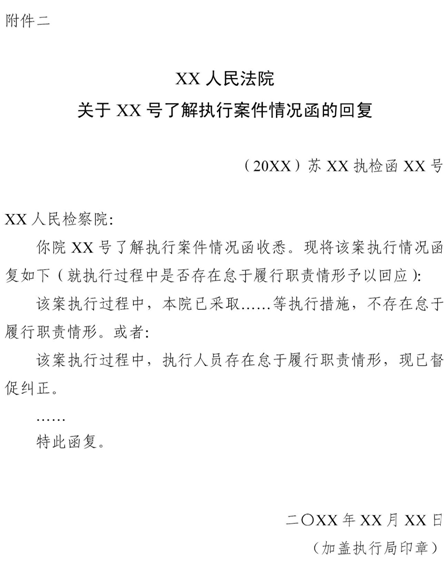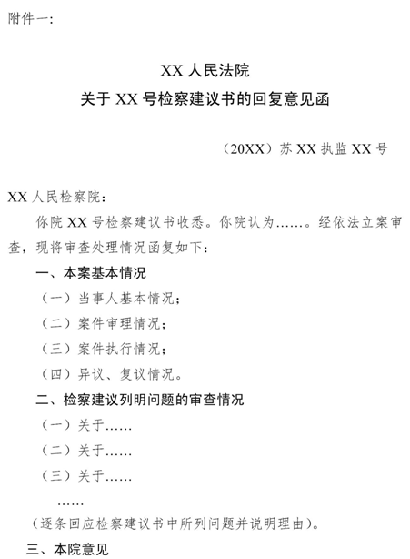 15. 民事執(zhí)行檢察監(jiān)督案件的審查處理情況,應(yīng)當(dāng)以《回復(fù)意見(jiàn)函》(見(jiàn)附件一)形式回復(fù)提出檢察建議或者跟進(jìn)監(jiān)督的檢察機(jī)關(guān)?!痘貜?fù)意見(jiàn)函》應(yīng)當(dāng)編立執(zhí)行監(jiān)督案件案號(hào),載明人民法院查明的事實(shí)、回復(fù)意見(jiàn)和理由并加蓋院章。采納檢察建議的,應(yīng)當(dāng)附相關(guān)執(zhí)行裁定、決定等法律文書(shū)。必要時(shí),可隨函附上相關(guān)證據(jù)材料。