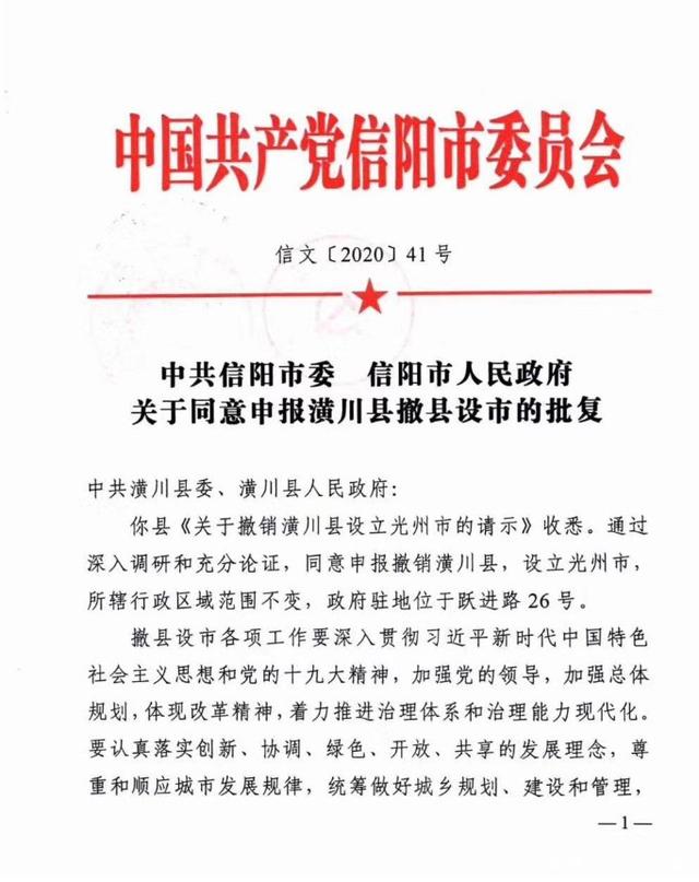 信文〔2020〕41號(hào)《中共信陽(yáng)市委信陽(yáng)市人民政府關(guān)于同意申報(bào)潢川縣撤縣設(shè)市的批復(fù)》