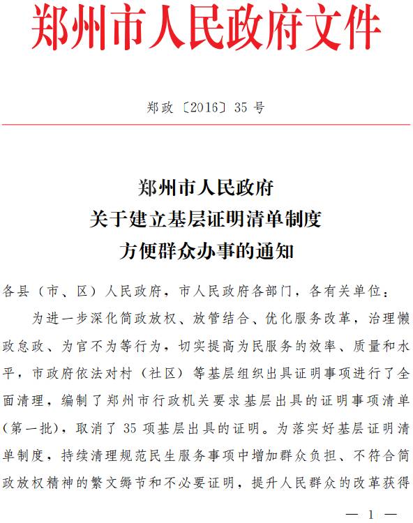 鄭政〔2016〕35號《鄭州市人民政府關(guān)于建立基層證明清單制度方便群眾辦事的通知》