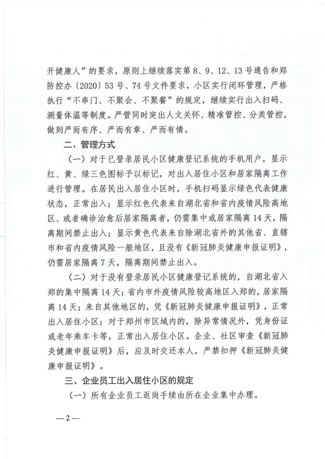 鄭州市新型冠狀病毒感染的肺炎疫情防控領導小組辦公室關于企業(yè)復工復產(chǎn)后居民小區(qū)管理工作的通知