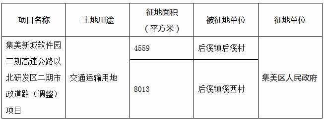 根據(jù)《中華人民共和國土地管理法》《征收土地公告辦法》等有關(guān)規(guī)定,經(jīng)《福建省人民政府關(guān)于廈門市集美區(qū)2018年度第三批次農(nóng)用地轉(zhuǎn)用和土地征收的批復(fù)》(閩政地〔2018〕1230號)批準(zhǔn),征收集美區(qū)后溪鎮(zhèn)后溪村集體土地4559平方米,后溪鎮(zhèn)溪西村集體土地8013平方米,上述合計(jì)征收12572平方米集體土地;收回后溪鎮(zhèn)農(nóng)場國有土地7621平方米,作為集美新城軟件園三期高速公路以北研發(fā)區(qū)二期市政道路(調(diào)整)項(xiàng)目建設(shè)用地。現(xiàn)將有關(guān)事項(xiàng)通告如下: