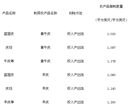 (二)上述產(chǎn)品所屬行業(yè)范圍按照《國民經(jīng)濟(jì)行業(yè)分類》(GB/T4754-2011)“皮革鞣制加工”(代碼:C1910)執(zhí)行,耗用農(nóng)產(chǎn)品為黃牛皮或羊皮,未按皮革鞣制加工業(yè)登記但實際從事該行業(yè)生產(chǎn)的納稅人也屬于試點范圍。