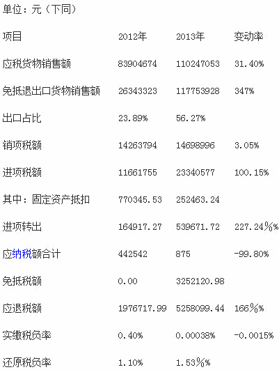 ②增值稅稅額變化情況:實(shí)際申報(bào)繳納增值稅2012年44.25萬元,2013年僅0.08萬元;免抵稅額2012年為0,2013年為325.21萬元。