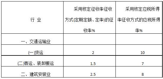 三、“對企事業(yè)單位的承包經(jīng)營、承租經(jīng)營所得” 的核定征收標(biāo)準(zhǔn):交通運(yùn)輸業(yè)的征收率為0.5%,建筑安裝業(yè)的征收率為0.6%。