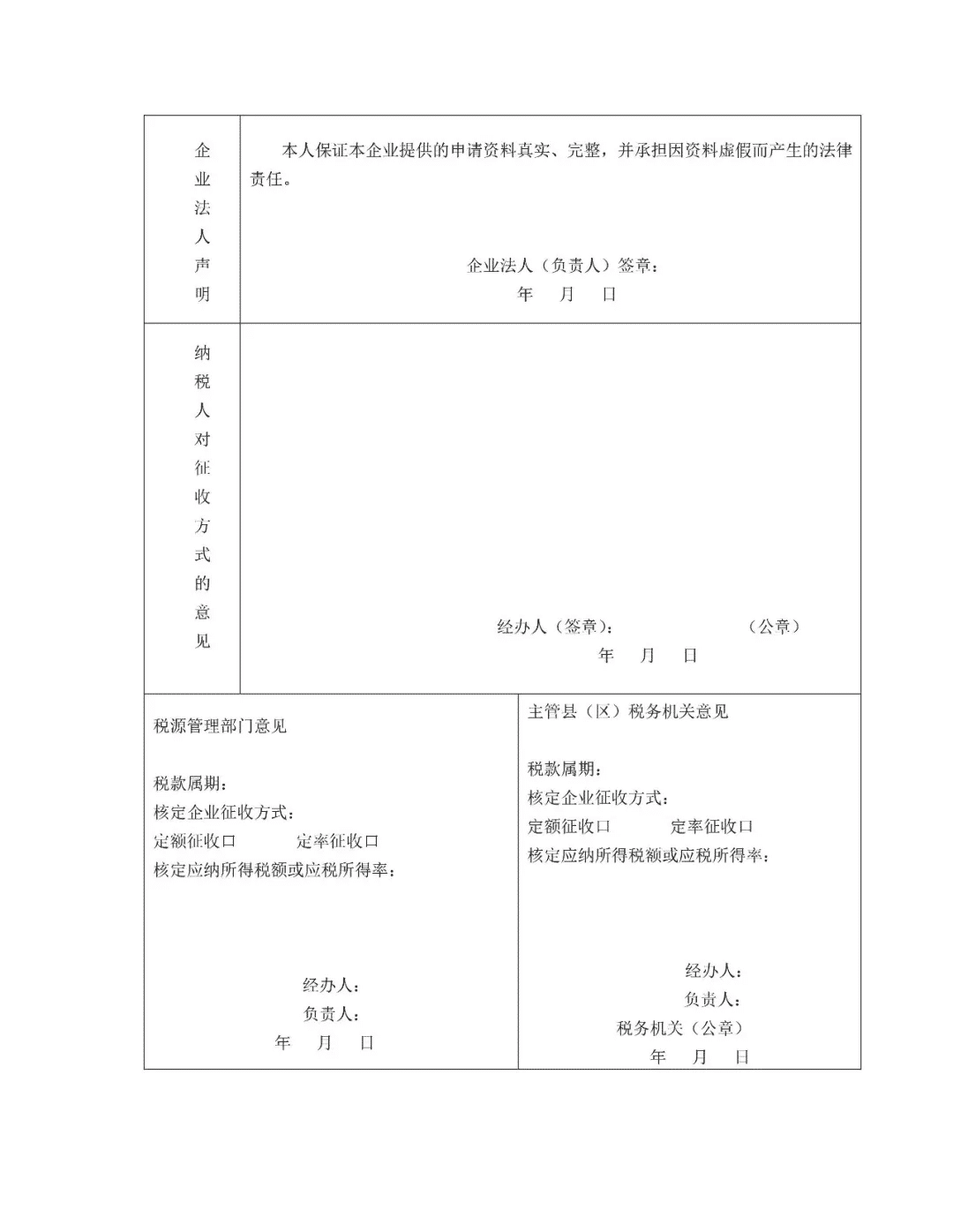 第七條 企業(yè)征收方式發(fā)生變更的(由查賬征收變?yōu)楹硕ㄕ魇?,或由核定征收變?yōu)椴橘~征收的)應(yīng)在《企業(yè)所得稅核定征收鑒定表》中注明變更原因?!镀髽I(yè)所得稅核定征收鑒定表》一式三份,企業(yè)所得稅管理部門一份;稅源管理部門一份,作為納稅人征管檔案;另一份送達(dá)納稅人執(zhí)行。